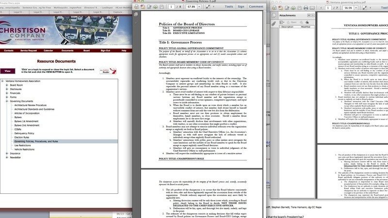 The photo above is a computer screen-shot of the Christison Company Website taken April 15, 2013, showing two documents, (1) Policies of the Board of Directors, and (2) Ventana Homeowners Association. Policies in these documents have not adopted by the board, both documents falsely represent the management agent as Chief Executive Officer, and set forth terms of authority not granted the management agent in The Book of Governance for Ventana Homeowners Association adopted by Ventana Homeowners Association. These document are available upon request.