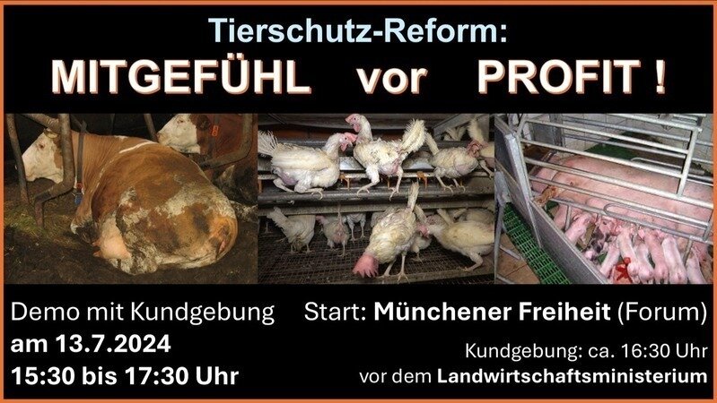 am Samstag, den 13.7., wollen wir dagegen demonstrieren, daß der aktuelle Entwurf für das neue Tierschutzgesetz den Lobbyinteressen der Tierindustrie zum Opfer fällt. Die minimalen Verbesserungen, die der Entwurf enthält, dürfen nicht noch weiter abgeschwächt werden.