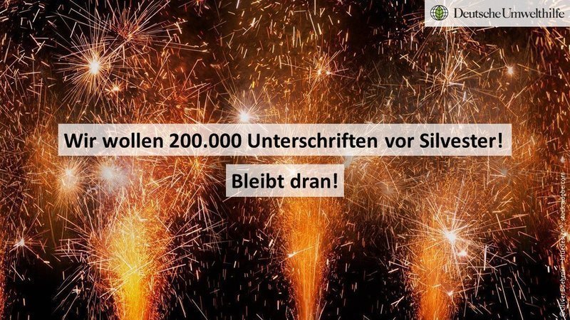 Liebe Unterstützer/innen! Es sind noch 12 Tage bis Silvester- bis die sinnlose Böllerei und Verschmutzung unserer Umwelt erneut beginnt. Unser Ziel ist es in diesen 12 Tagen die 200.000 Unterschriften zu knacken. Ich denke wir können das mit eurer Hilfe schaffen! Also verbreitet die Petition per Mail, auf euren Social Media Kanälen oder persönlich. Eure Freunde finden die Petition unter: www.change.org/silvesterfeuerwerk Das Nachrichtenportal NOIZZ hat uns seine Unterstützung zugesagt und mit deren und eurer Hilfe können wir unser Ziel erreichen!