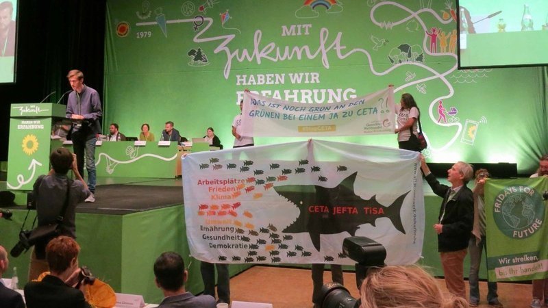 Nur einen Tag später am 21.9. machten wir auf der Landesdelegiertenkonferenz der Grünen in Sindelfingen deutlich: Klimaschutz UND CETA geht nicht! Im Applaus für die Rede von Herrn Kretschmann stürmten 10 AktivistInnen des Netzwerk Gerechter Welthandel Baden-Württemberg mit Unterstützung von Fridays for Future Baden-Württemberg auf die Bühne der Konferenz. Ludwig Essig, Pressesprecher des Netzwerks erklärte am Rednerpult unter tosendem Applaus der Delegierten, dass CETA Klimaschutz unmöglich macht und die Grünen in der Landesregierung CETA unbedingt stoppen müssten. Zuvor verteilten wir unseren Offenen Brief Gute GRÜNdE gegen CETA. Auch nach der Aktion bekamen wir von vielen Delegierten positive Rückmeldungen. Wir sind uns sicher: Herr Kretschmann kann uns nicht mehr ignorieren! Gemeinsam haben wir die Diskussion um CETA wiederaufleben lassen. Neben zahlreichen Print und Onlinemedien berichtete auch das Radio über unsere Aktion. Wer heute noch klimaschädlich handeln möchte (und gleichzeitig Versprechen bricht), hat es sehr sehr schwer!