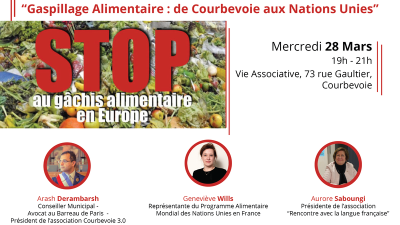 Vous êtes invités le mercredi 28 mars 2018 à la Vie Associative (73, rue Gaultier 92400 Courbevoie) pour la conférence « Gaspillage Alimentaire, de Courbevoie aux Nations Unies ». La conférence aura lieu de 19h à 21h.
