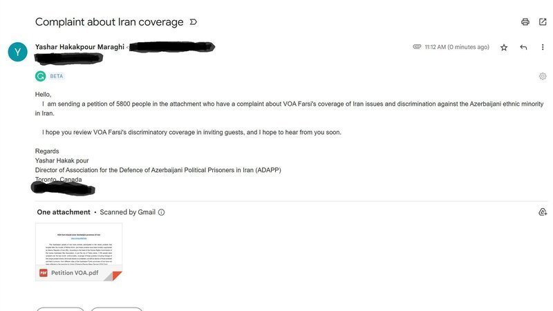 Mən bu petisiyanı Amerikanın Səsi Fars bölümünün direktoruna jurnalistlər vasitəsilə göndərdim. Habelə USAGM-ə bir neçə e-mail göndərdim, emailin görüntüsünə burada baxa bilərsiniz.