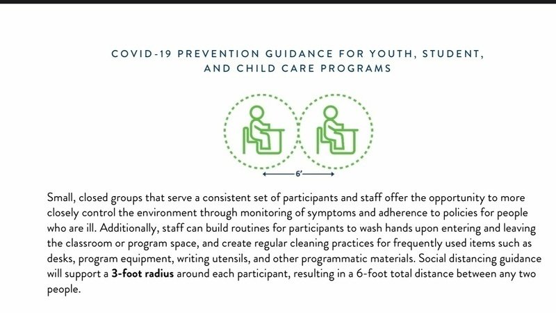 O organismo estadounidense de control de epidemias (CDC) publicou as normas para as escolas americanas e téñenno claro: cada alumno debe ter un radio libre de 3 pés arredor (0.9m), é dicir, 1,8m de separación entre rapaces!