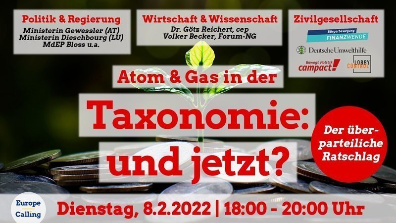 Der Verein Europe Calling veranstaltet Webinar-Reihen zu aktuellen gesellschaftsthemen in der Europäischen Union. Der frisch gegründete Verein hat für heute Abend um 18 Uhr die Konferenz zur Taxonomie ins Leben gerufen. Umweltministerinnen aus Luxemburg und Österreich, aber auch EU-Parlamentarier*innen von der CDU, SPD und auch meiner Wenigkeit werden vor Ort sein. Jetzt fehlt nur noch Ihr. Kommt dazu und diskutiert mit uns darüber, stellt Eure Fragen.