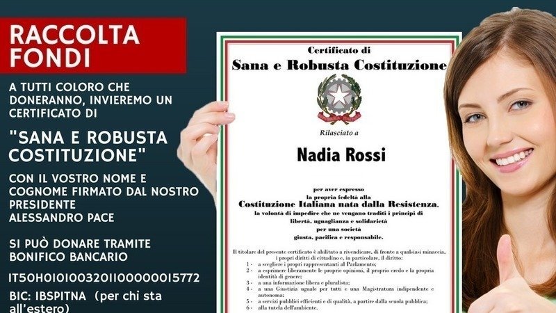 Per combattere la disinformazione e far arrivare a tutti le ragioni del NO, abbiamo bisogno di ulteriori risorse, quelle attuali ci consentono di arrivare solo fino al 4 novembre, dopodiché avremo finito tutte le risorse. Questa volta, per ringraziarvi, manderemo a tutti coloro che donano, comunicandocelo all’indirizzo e-mail (salvalacostituzione@gmail.com), un “Certificato di sana e robusta Costituzione” con il vostro nome e cognome e la firma del nostro Presidente. Qui un facsimile: goo.gl/r3pP9M