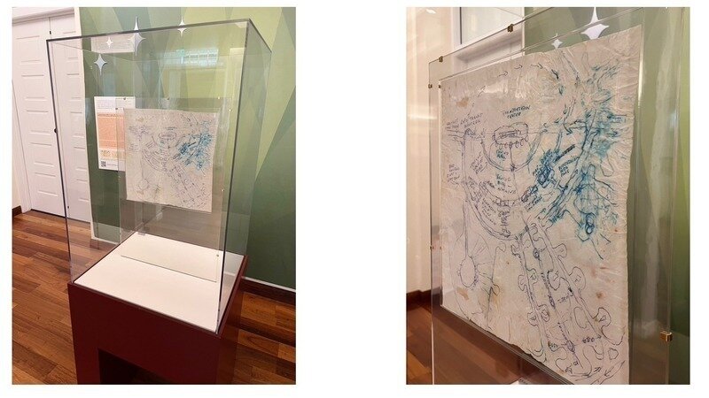 This napkin was found—crumpled in the trash—by Walt’s gardener, who stored them in a safe deposit box for many years. The museum acquired the drawings in 2011 from the gardener’s son. Diane Disney Miller, recognizing her father’s handwriting, confirmed that Walt himself drew these sketches.