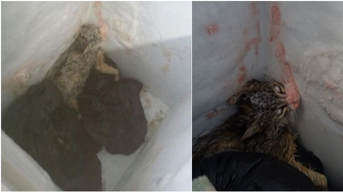 - What is the explanation for the deep grooves/claw-like marks in the ice inside the freezer, the blood smears on the four walls of the freezer and the strange crouching position of the cat?