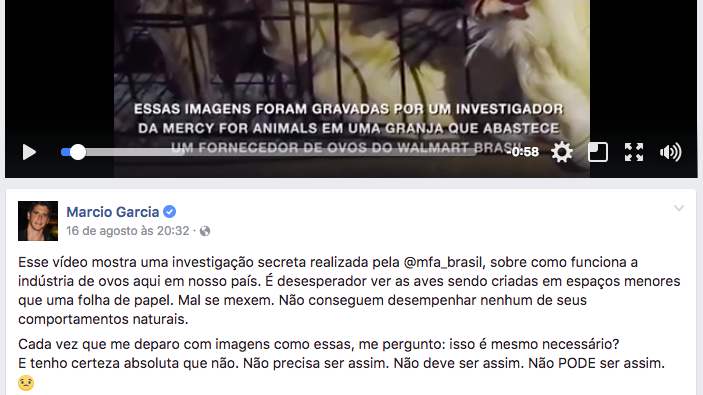 O ator e apresentador Marcio Garcia publicou o vídeo da investigação que expôs a indústria de ovos no Brasil em sua página no Facebook. Ele afirma que é desesperador ver as aves criadas em espaços menores que uma folha de papel. Confira a publicação aqui: https://www.facebook.com/oficialMarcioGarcia/videos/1494072887317244/