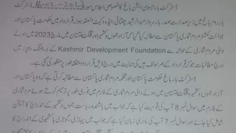 The District Bar Association Bagh has passed a resolution supporting the Kashmir Development Foundation campaign for inclusion of Bashinda-e-Riyasat Jammy and Kashmir in the Census 2023 form.