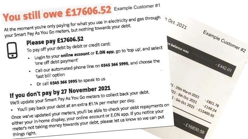 £35,000 of payment demands to two domestic energy customers, pursued by Eon for payment of knowingly inaccurate billing after energy companies and the regulator Ofgem concealed catastrophic data losses in energy companies' billing systems.