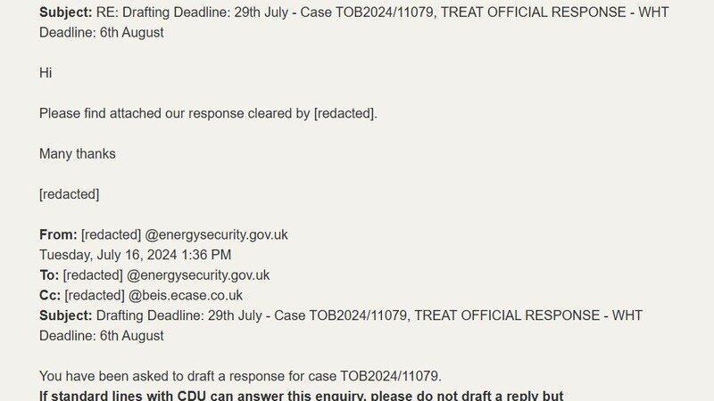 Despite a denial of any involvement from UK Government's Counter Disinformation Unit (CDU), received in response to an April 2024 FOI request, an FOI request served on DESNZ in August 2024 received a response that included interdepartmental emails with BEIS confirming the CDU's involvement.
