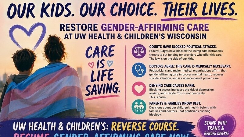 We are parents, caregivers, community members, and allies calling on UW Health and Children’s Wisconsin to immediately reverse course and restore access to gender-affirming care for our children and families.