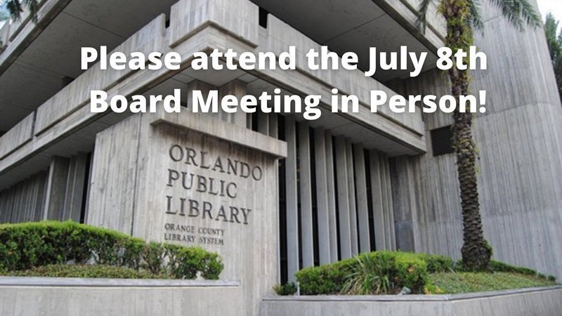 Please plan to attend the next library board meeting in person as it should be an important one! The City and County are expected to present a proposal to the OCLS about financing options for the construction of new branches in the Lake Nona area and Horizon West. Here are the details: