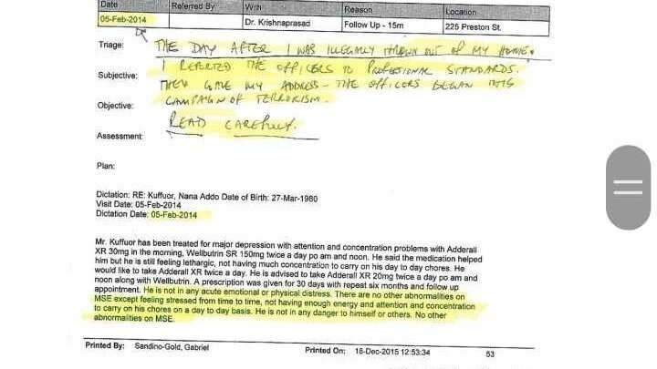 This is my mental health record from the next day. I filed my complaint two days later, with this to show I am of sound mind as I report this officer as a racist who deliberately hid behind my need to go through a process to prove I was harmed to threaten me with physical harm if I didn't leave my home.