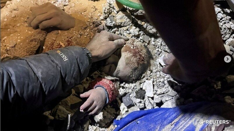 People work to rescue Palestinian girl Mariam Abu Akel, who is alive, from under the rubble of a house hit by an Israeli strike in Rafah in the southern Gaza Strip, December 29, 2023. Rescuers in orange vests shouted as they reached her in the rubble after another night of bombardment of the Palestinian enclave. Her skin was grey with dust and she made little noises as the rescuers worked to free her legs and lift her clear of the rubble.