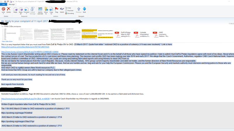 Please complain to European Commission it's urgent and most important . Here is only a small part of what I have written and included. I will be sending more as the ideas come to me. We the minority NWR shareholders must proof that the Czech Republic is not following European (Euro Zone) laws. And has an intention to steal OKD from us.