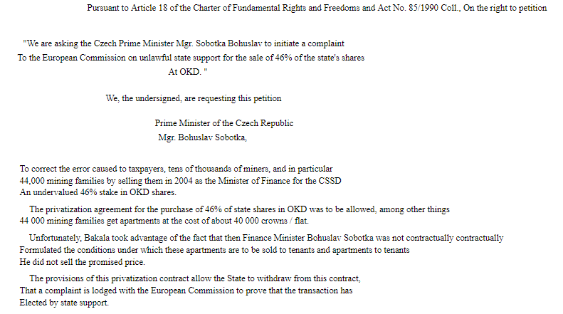 And this new petition is in regards to OKD and started on 29 June 2017. But to me in my humble opinion it will most likely take out, and or damage the current Czech Republic Prime Minster Bohuslav Sobotka. Who at the time of OKD privatisation in 2004 was a finace minster. This new petition is in regards to 2004. Its a little late 13 years to late!. Czech Government was offered by AHG group to buy OKD for 120 million euro in 2016. They didn't want to buy called it worthless 1CZK. Why buy OKD back and I am alleging, that the Czech Republic is using subterfuge, treachery and making OKD put fabricated publicly company statements that the company is bankrupt and not making massive profits. When this is not the truth. We all know who is ultimately responsible for causing a false issued insolvency petition, Mr Bakala, the AHG group and the alleged incompetent NWR/OKD former directors. To the European Commission and the ESMA, We the minority shareholders who have signed this petition. We most humbly request for your assistance and to immediateness intervene into OKD which is 100% owned by New World Reources PLC. Czech Politicians are implicated and can not be trusted as they will protect there own agenda (skin). We ask the European Commission and ESMA European Securities and market authority. To show the word that Europe can and will be a safe place to invest money. And not have Governments play a game of thievery with assets they sold many years ago. ( Bestower, Indian giver) My apologies to anyone I have offended. I am sorry and I know I do really lack subtlety . But our life’s as the Minority shareholders of New World resources have suffered for so many years. And we did not have any doing in these alleged illegal and criminal acts by so many nameless people who should really know better. I wish you the best of luck to all us minority shareholders. And I do feel the tide is and will turn in our favour. Keep up the fight and never give up. Please write a complaint to the European Commission, ESMA, And the European Ombudsman. And add this petition. Best of Luck Aussie 17 July 2017 Rotterdam thermal 6000Kcal coal up to 85.45 USD
