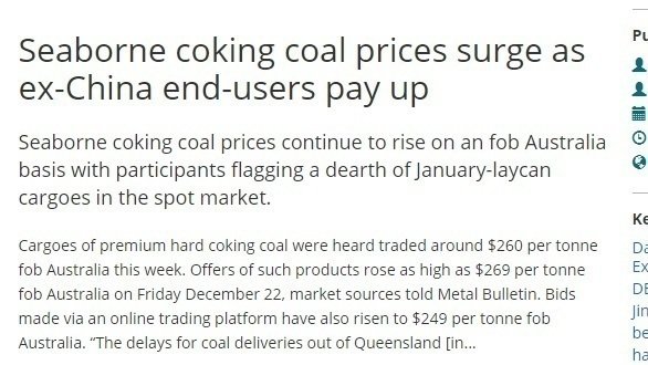 http://ceskapozice.lidovky.cz/kauza-okd-proces-k-privatizaci-dolu-speje-k-zaveru-asi-v-unoru-p63-/tema.aspx?c=A171225_122244_pozice-tema_lube - 27 December 2017 Excellent news article. OKD and incompetence and the years going by while nothing gets done. https://www.metalbulletin.com/Article/3775728/in-depth/2017-REVIEW-Coking-coal-market-not-catching-a-break.html -Metal Bulletin’s fob Australia premium hard coking coal index averaged $184.63 per tonne from January 2 to December 15, 2017, a 29.6% increase from the $142.44-per-tonne average in the same period of 2016. OKD after 1st April 2017 forecast cash costs of 60 euro per tonne!. https://www.parlamentnilisty.cz/arena/monitor/-V-roce-2018-bude-opet-v-popredi-zajmu-tezebni-spolecnost-OKD-517673 -26 Dec 2017 OKD we all are waiting for the decision of the High Court in Olomouc regarding the reorganization plan. The debt should have been reorganised and PASKOV saved. So I today on the 27.12.2017 sent my same emails as I have sent to the District Courts in Prague, Ostrava. We the minority shareholders of New World Resources are “irrepressible”. https://www.metalbulletin.com/Article/3777718/coking-coal/Premium-hard-coking-coal-offers-remain-above-260-per-tonne-fob-Australia.html - 26th Dec 2017 hard coking coal traded around $260 per tonne. Offered at $265 per tonne fob Australia. https://postimg.org/image/gj6tdnoid/ 22nd Dec 2017 friday https://www.barchart.com/futures/quotes/LU*0/all-futures 22nd Dec 2017 Thermal coal 6000 Kcal near 95 usd dollars a tonne. OKD cash cost near or below a claimed 60 euro a tonne.