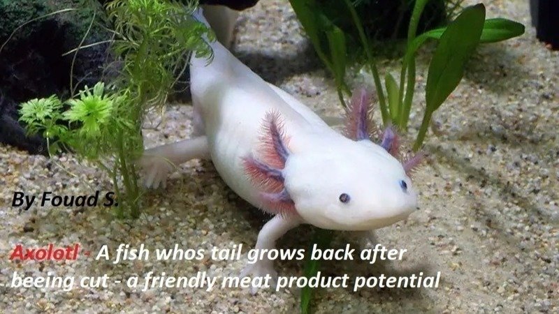 Dear cat friends and lovers , following my latest email , here is a fish called Axolotl , who has bodyparts that grow back after being cut off , including tail and legs . If we farm it and cut off its tail for meat , we could make an a friendly meat product ;)
