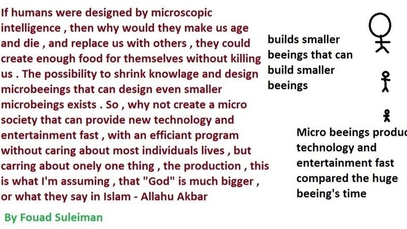 If humans were designed by microscopic intelligence , then why would they make us age and die , and replace us with others , they could create enough food for themselves without killing us . The possibility to shrink knowlage and design microbeeings that can design even smaller microbeings exists . So , why not create a micro society that can provide new technology and entertainment fast , with an efficiant program without caring about most individuals lives , but carring about onely one thing , the production , this is what I'm assuming , that "God" is much bigger , or what they say in Islam - Allahu Akbar