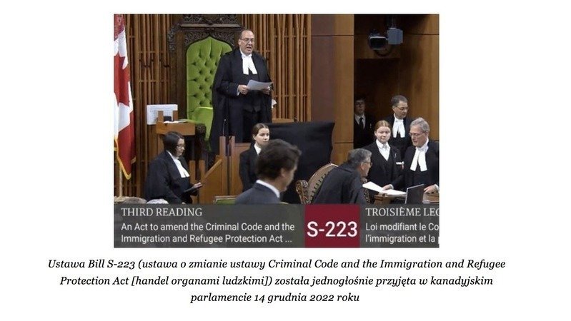 (Minghui.org) 14 grudnia 2022 roku Izba Gmin parlamentu Kanady jednogłośnie przyjęła ustawę S-223 w celu zwalczania nielegalnego pobierania i handlu ludzkimi organami 324 głosami. Ustawa jest uważana za ważną podstawę prawną, która pozwoli zwalczać przymusową grabież organów od żywych ludzi.