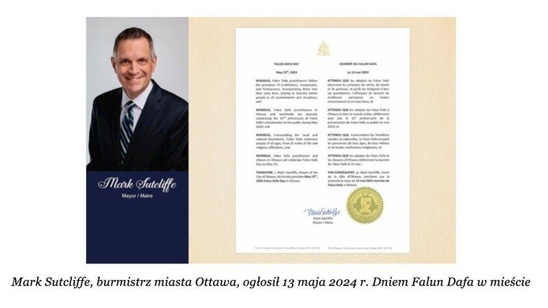 (Minghui.org) Aby uczcić 25 Światowy Dzień Falun Dafa i 32 rocznicę publicznego wprowadzenia Falun Dafa, Mark Sutcliffe, burmistrz Ottawy, ogłosił 13 maja 2024 r. Dniem Falun Dafa w mieście.