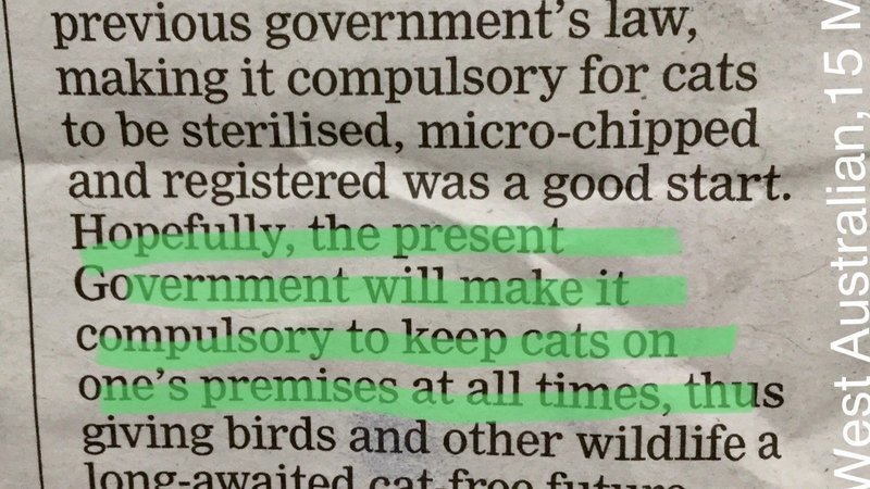 People are tiring of unstringent cat regulations. This letter appeared in The West last month in support of better protections for our wildlife.