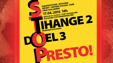 => Am So, 17.04, startet um 14 h in Lüttich/ Luik/ Liége am Bhf. Guillemins eine internationale Demo gegen Tihange & Doel. Anreiseinfo unter: www.stop-tihange.org