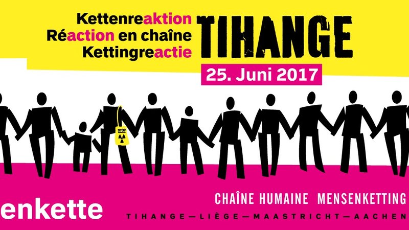 Am 25. Juni bietet sich nun die einmalige Chance, ein unübersehbares Zeichen gegen Tihange zu setzen und den Druck auf die belgische Regierung zu erhöhen: Mit einer Menschenkette unter dem Motto „Kettenreaktion Tihange“ werden sich auf 90 Kilometern zwischen Aachen (D), Maastricht (NL), Lüttich (B) und Tihange (B) zehntausende Menschen in und aus drei Ländern die Hand reichen für eine klare Botschaft: Tihange muss sofort abgeschaltet werden.