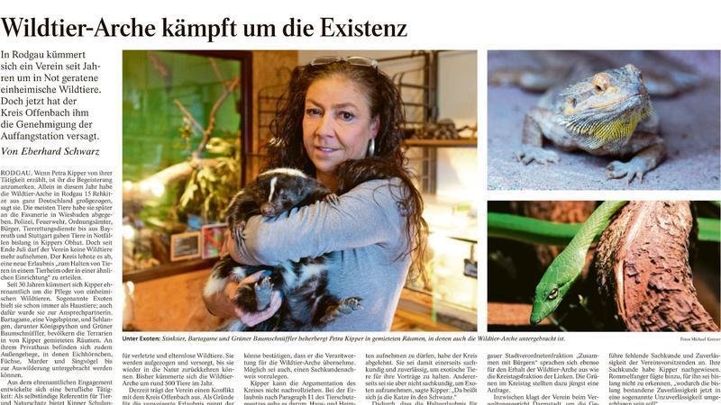 Dadurch, dass die Halteerlaubnis für heimische Wildtiere befristet gewesen sei, „geht meine Sachkunde nicht verloren". Eine Rodgauer Tierärztin, die auch dem Vereinsvorstand angehört, erklärte sich schon 2014 bereit, die Verantwortung für die Wildtier-Arche zu übernehmen. Das Schreiben wurde dem Kreis damals zugefaxt; Kipper legte eine Faxbestätigung dafür vor.
