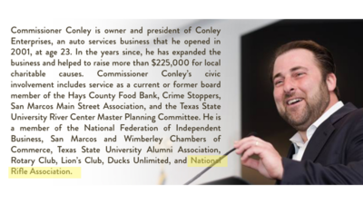 We hereby call on Will Conley, and any other candidates for office in Hays County, to disassociate from the NRA immediately, by refusing money from that organization and removing any supportive mention of them from their campaign websites.