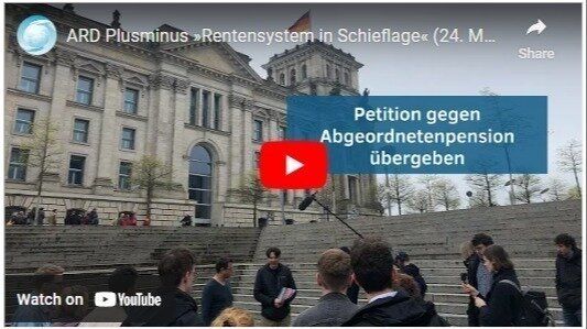 Kürzlich wurde in der NDR-Sendung "Plusminus" über unsere Forderung nach der Abschaffung der Abgeordnetenpension berichtet. Wir laden Sie herzlich ein, den Beitrag "Rentensystem in Schieflage" in der ARD Mediathek oder auf unserem YouTube Kanal anzuschauen.