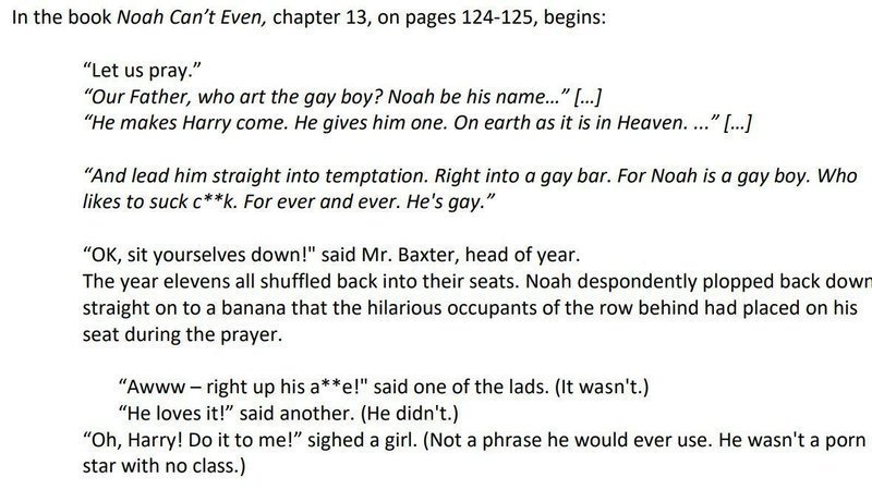 “Let us pray,” “Our Father, who art the gay boy? Noah by his name..” Oh yes, “people have better things to think about.” “He makes Harry come. He gives him one. On earth as it is in heaven…’ “And lead him straight into temptation. Right into a gay bar. For Noah is a gay boy. Who likes to suck cock. For ever and ever. He’s gay.” “OK, sit yourselves down!” said Mr. Baxter, head of year. The Year Elevens shuffled on their seats. Noah despondently plopped back down, straight onto a banana that the hilarious occupants of the row behind had placed on his seat during the prayer. “Awww - right up the arse!” said one of the lads. (It wasn’t.) “He loves it!” said another. (He didn’t.) “Oh, Harry! Do it to me!” sighed a girl. (Not a phrase he would ever use. He wasn’t a porn star with no class.)