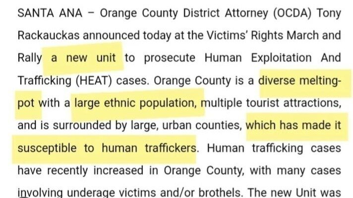 An article from the Orange County District Attorney's official website highlights the creation of the Human Exploitation And Trafficking (HEAT) unit under DA Tony Rackauckas. While seemingly created to combat human trafficking, the language used in this announcement reveals deep systemic racism embedded within the OCDA's approach.