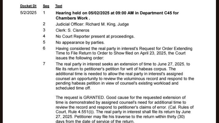 Today, the court issued a *60-day extension* to the District Attorney’s Office, pushing their deadline to respond to Chazz’s habeas petition to June 27, 2025. The court claims DA Holly Woesner needs more time due to “voluminous records,” her workload, and scheduled time off.