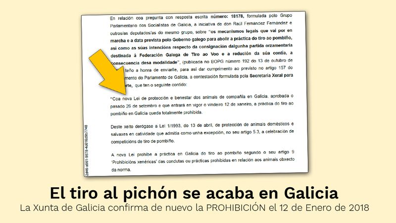 La Xunta de Galicia ha trasladado una nueva confirmación del fin de los campeonatos de tiro al pichón y le pone fecha: El 12 de Enero de 2018 esta práctica cruel pasará a ser ILEGAL en la comunidad.
