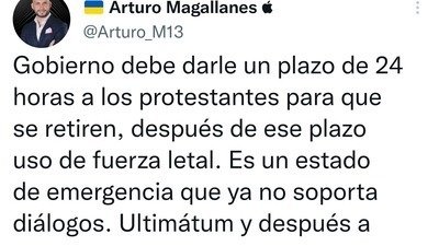 El comentarista deportivo Arturo Magallanes, mediante Twitter emitió comentarios racistas, generalizados y lamentables, al límite de toda ética profesional, llamando al estado a utilizar fuerza letal contra todos los manifestantes, incluso los pacíficos, esto, por el único delito de manifestarse ante las terribles condiciones de pobreza y desigualdad en la que se encuentra la mayoría de la población.