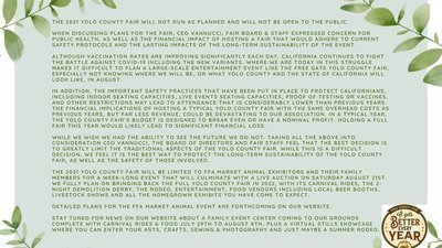 Recently, the Fair Board announced that the Fair will not be held as planned in 2021. Children are back in school, youth sports have resumed, all retail is open and indoor dining has resumed. Statewide, concerts are resuming, professional ballgames are being attended, amusement parks are opening and other counties are hosting their fairs. There seems to be no basis for canceling such an important community event. At the time of this writing, there have been 22 new cases and 1 person is hospitalized in the county. 45% of the state of California has been vaccinated.