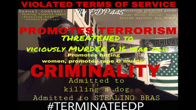 Get "eatdatpussy445" terminated off of YouTube for violent & criminal content.