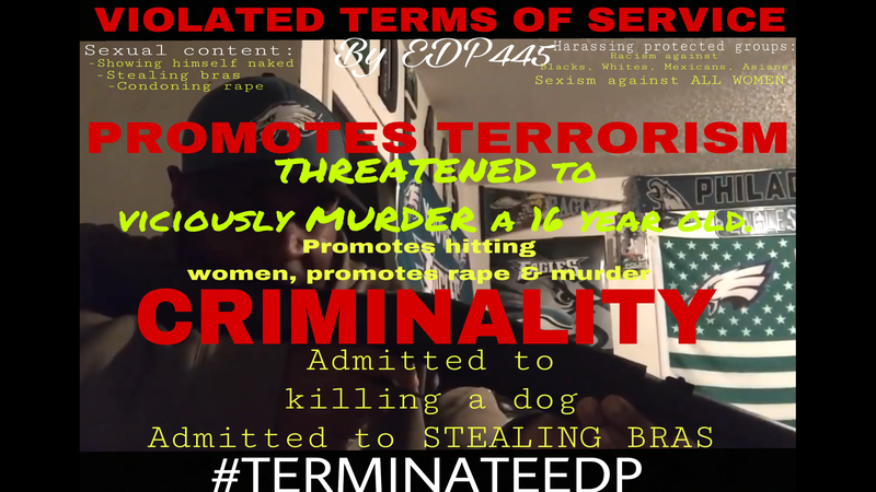 As we all know, "eatdatpussy445" has ran into community guideline strikes as of recent. Constant people have been defending him over the past week & want him to stay on YouTube. But based on plenty of his videos, he promotes nothing but violence & hate towards ALL WOMEN, Black, White, Mexican & Asian people constantly by objectifying women as "shallow ass bitches" & says stuff like "Asian bitches are a trip" or "Mexican need to close their legs & stop fuckin'". On top of that, he's made sexually disturbing videos like "stolen bra collection" where he admits to a criminal act & theft of bras & talked very sexually in the video about masturbation & ejaculation. He has also had a video where he STRIPPED NAKED & displayed his rear end on YouTube which obviously violates the guidelines for sexual content & extremely inappropriate disturbing content. Also, he's made videos CONDONING hitting women & has claimed to kill a dog & outright said that he would "rape & murder people". He also promotes fighting 13 year olds & promotes plenty of physical violence.