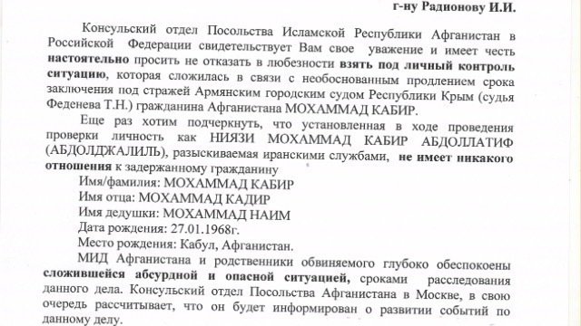 Здравствуйте! Мне очень нужна помощь . С нами произошла в Крыму жуткая ситуация. Мой муж уроженец Афганистана. Мы с детьми в 2016 году в сентябре ехали с Украины в Крым на отдых. Моего мужа на пункте пропуска Армянск задержали и сказали что он в розыске Интерпола Ирана с 2010, при том что с разыскиваемым совпало только имя!!! Разные фамилии, разные отчества, и без даты рождения!  До этого мы беспрепятственно ездили по Европе , Турции, в 2013 году ездили к родственникам в Россию через Белгород, и нигде проблем не возникало. Муж никогда не был в Иране!! На протяжении 9 месяцев я обращалась везде. О нас выходили публикации в газетах, разные правозащитные организации нам тоже помогают , но пока без результата. Посольство Афганистана не однократно отправлял и в прокуратуру РФ и прокуратуру Крыма , и в суд письма о том что Кабир не имеет к разыскиваемому никакого отношения! Вчера опять продлили до года. Судья Исроилова Венера .При том что во время суда появился у прокурора документ с Ирана о том что в сентябре 2016 года в Иране снова этим мошенником совершенно преступление. В это время мой муж находился в Сизо!! Он перенёс в Сизо второй инсульт, до этого был в 2015 году инсульт. Никто его не обследует, хоть адвокат много раз подавал ходатайство о мед освидетельствование, но нас игнорируют, и только после того как в московском комсомольце вышла публикация, его перевели в сан часть. Просто перевели и забыли. Все вокруг понимают что совершили ошибку, но никто за неё не хочет отвечать. Каждый день мои дети плачут по папе.  Пожалуйста помогите мне!! Если его незаконно отправят в Иран там ему грозит смертная казнь. Помогите пожалуйста