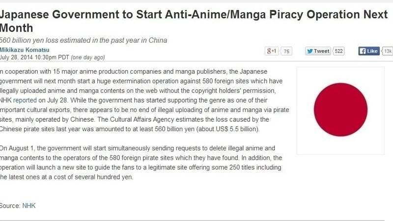 On July 28, Japan's Government started an Anti-Anime/Manga movement that will remove many titles from 580 foreign sites that published anime and manga without permission from the original creators. Japan wants foreign anime and manga fans to pay hundreds of yen to watch anime on a ligament site that only offers only a few out of all the anime that was released before. The movement will start on August 1; this maybe late to be made, but it is possible to soften the damage somewhat. They might be successful in the beginning, but the pirates will grow back and it will get ugly again. The pirates are like the mutli-headed dog Cerberus, you just can't remove one and be done, you have the other few to many heads to be taken care of. Even though you say you lose billions of yen annually, you will be losing even more because there are still many supporters that pay to watch anime. This movement is going to hurt the Japanese Government more than it is going to help it.