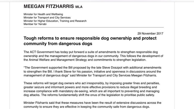 Change legislation to facilitate improved management of dog attacks in the A.C.T.