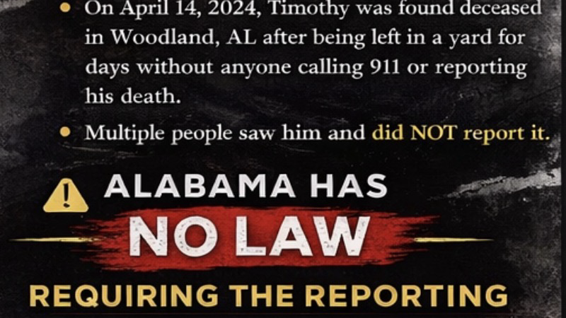 Pass Tim-Tim’s Law Alabama: Require 911 Call If Someone Is Found Deceased or in Distress