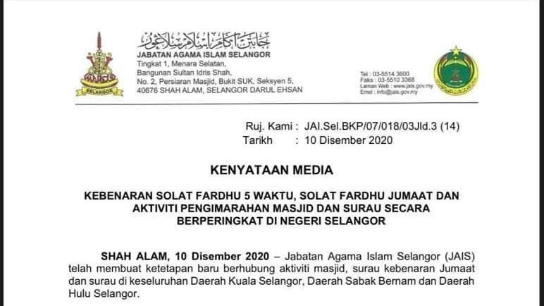 Kebenaran untuk membuka semula seluruh masjid di negeri Selangor