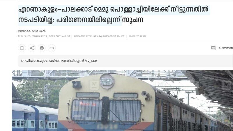 എറണാകുളം–പാലക്കാട് മെമു പൊള്ളാച്ചിയിലേക്ക് നീട്ടുന്നതിൽ നടപടിയില്ല; പരിഗണനയിലില്ലെന്ന് സൂചനമനോരമ വാർത്ത