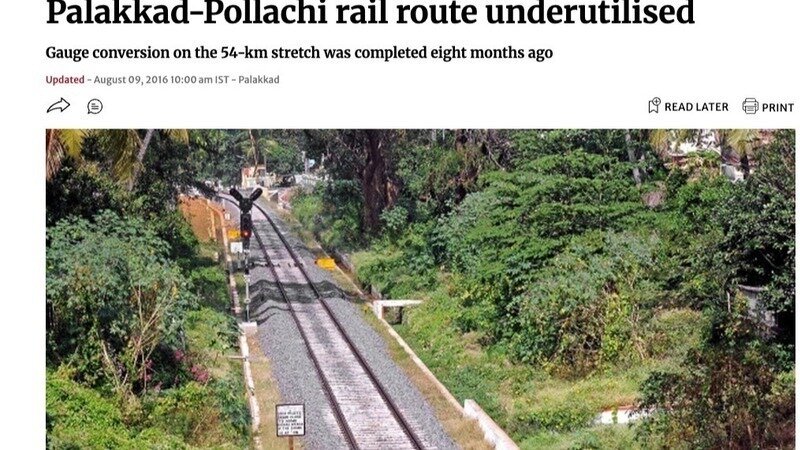Palakkad-Pollachi rail route underutilisedPalakkad-Pollachi rail route underutilisedGauge conversion on the 54-km stretch was completed in 2015The Hindu Newspaper Link Pala…Read full update